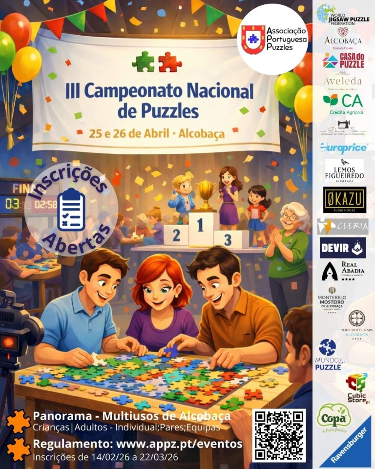 🚨🧩 INSCRIÇÕES ABERTAS 🧩🚨 O III Campeonato Nacional de Puzzles já está a chegar ao Panorama Multiusos de Alcobaça. 💪🧠 ✨ Junta-te a nós e vive um dia cheio de desafio, concentração e diversão pois é um evento para todos, seja para competir ou até apenas para divertir. 💰 Sócios APPZ com direito a desconto de 2€ (No momento da transferência, deduzir o valor do desconto). 🌍 Inscrições para todas as categorias no site da World Jigsaw Puzzle Championship. 📄 Regulamento disponível em www.appz.pt/eventos. Garante já o teu lugar! 🔥